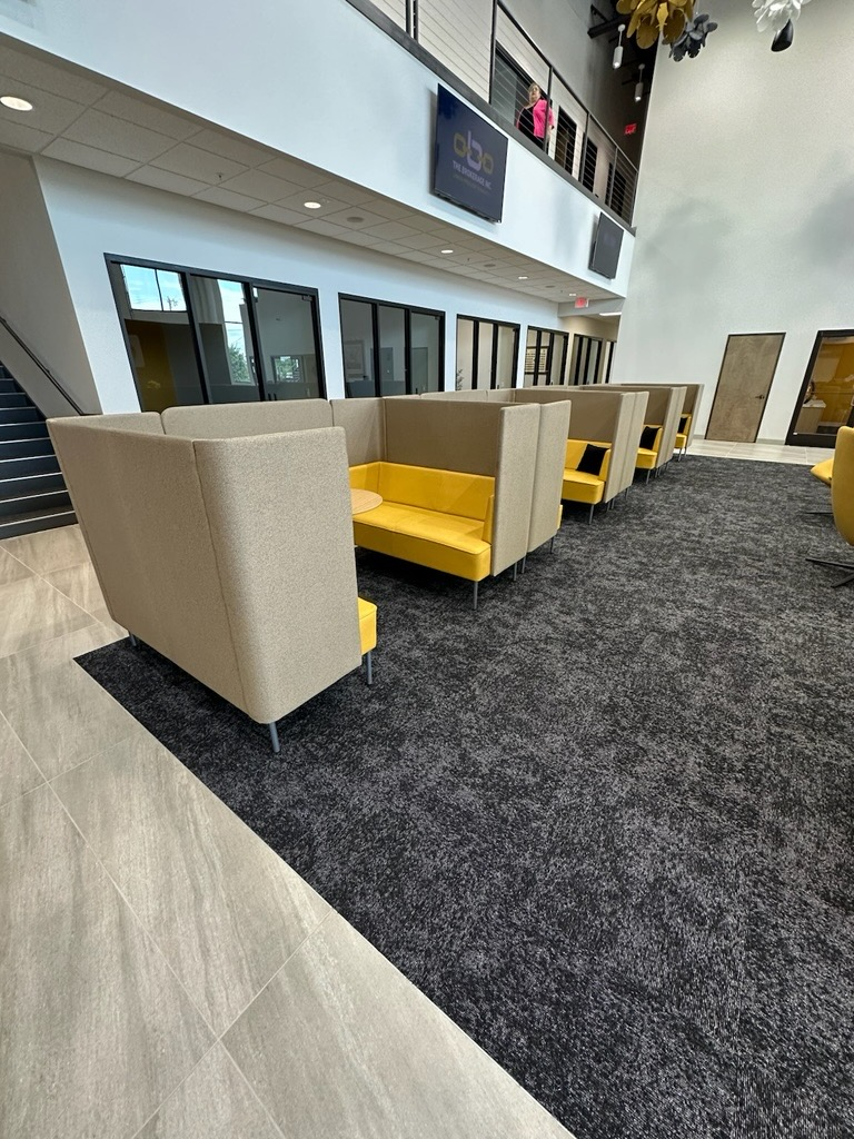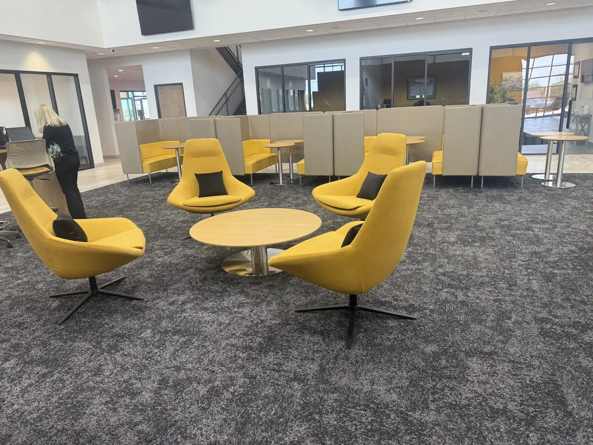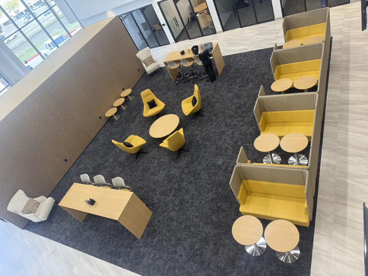 Transforming an auto dealership into a polished office environment required creativity, precision, and collaboration. The Brokerage, Inc. partnered with interior designer Anne Kniffen of Anne Kniffen Company to bring the vision to life. The client’s goal was to achieve a designer-specified, high-end look that is often associated with long lead times and high costs, while embracing a resimercial* design style that balances residential comfort with workplace function.